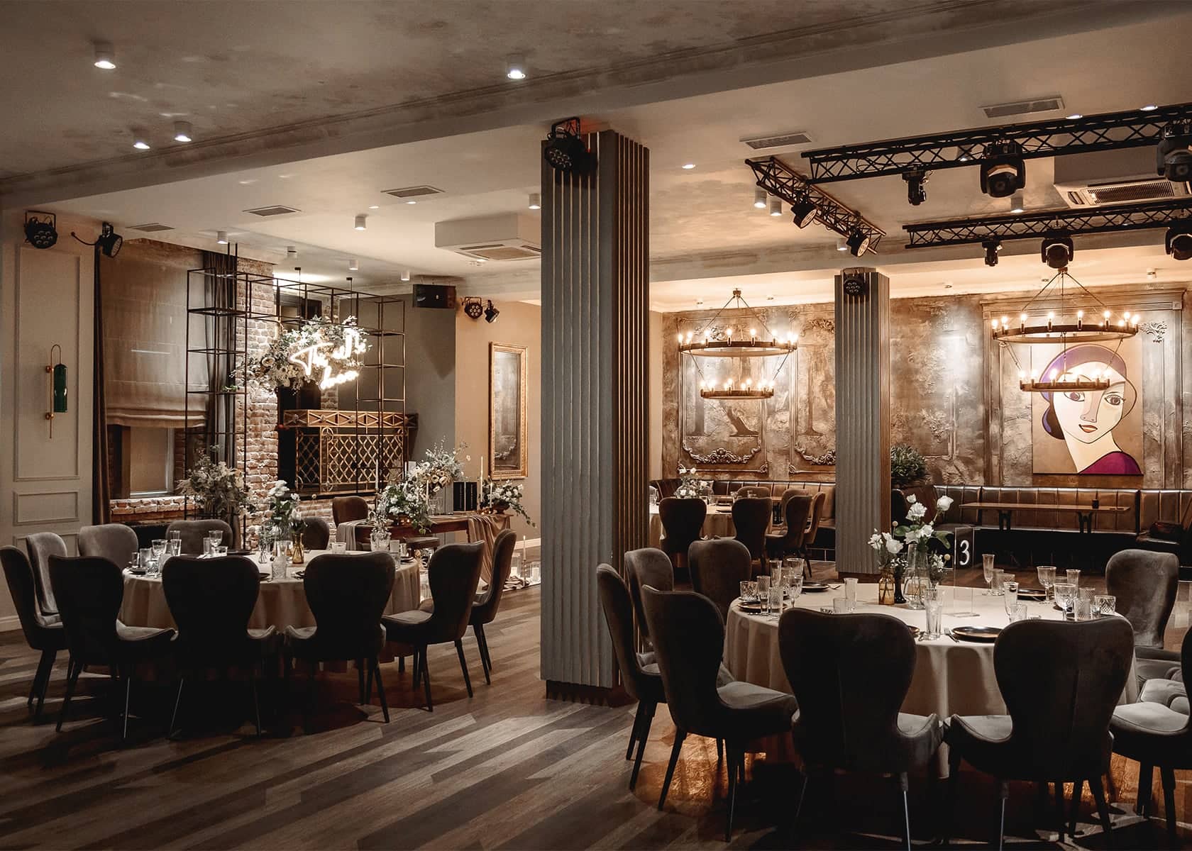 Удобная и стильная трансформируемая площадка с профессиональным мультимедийным оборудованием: большим видеоэкраном, световым и музыкальным оснащением и сценой для музыкантов.